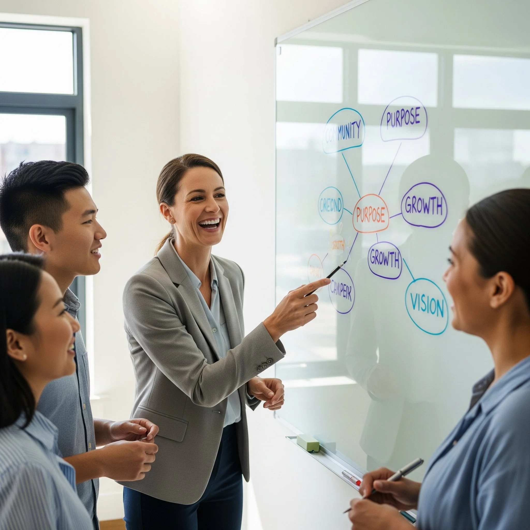 An inspiring clinic leader fostering a positive team culture. The team works together on their business vision, demonstrating a thriving practice built on shared purpose and passion.